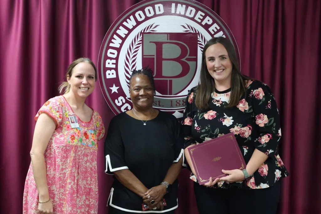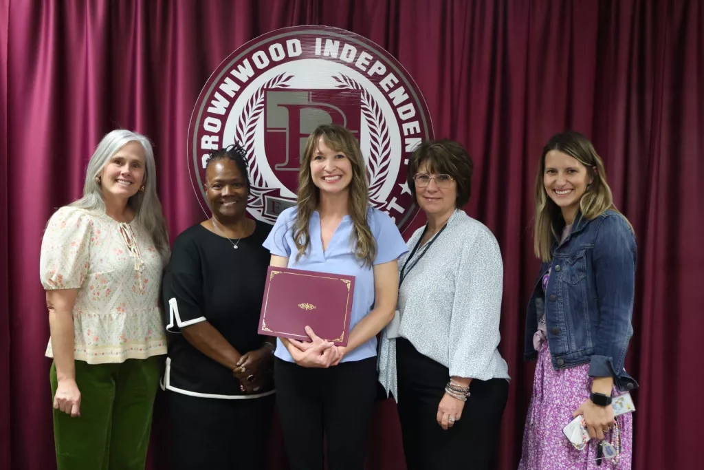 The Brownwood ISD Spotlight recognizes members of the BISD faculty and staff who go the extra mile to ensure excellence in education for all our students. Spotlight recipients are chosen from peer nominations. April 2025 honorees were Brownwood High School (BHS) English teacher Megan Norvil and Coggin Elementary Speech and Language Pathologist Alicia Stacks. Pictured (top) are BHS Principal Lindsay Smith, BISD Trustee Diane Thompson, and Spotlight Teacher Megan Norvil, and (bottom) Coggin Elementary Assistant Principal Monica Verner, BISD Trustee Thompson, Spotlight Staff Honoree Alicia Stacks, BISD Director of Special Populations Rebecca Faulkner, and Coggin Elementary Principal Kali McLaughlin.