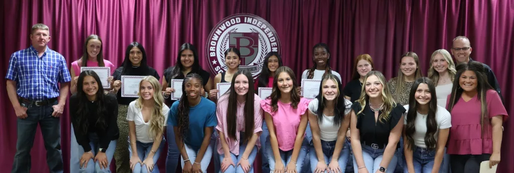 BHS Varsity Lady Lions Soccer team members were recognized for their season accomplishments with 16 athletes receiving All-District accolades and seven superlative honors including Coach Alexis Mosqueda-Walker being named District 5-4A Coach of the Year. Honorees are pictured above with BISD Trustee Posey, BISD Assistant Superintendent and Athletic Director Mitch Moore, and Coach Alexis Mosqueda-Walker.