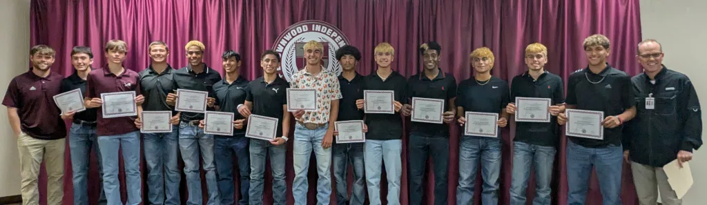 BHS Varsity Lions Soccer team members were recognized for their season accomplishments including a Bi-District and Area Championships. Ten athletes received All-District accolades, including three honorable mentions, three 2nd Team All-District, and two 1st Team All-District honors. Players are pictured above with Coach Michael Westerman and BISD Assistant Superintendent and Athletic Director Mitch Moore.