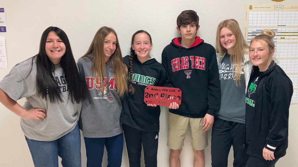 The Land Judging Team of Halle Lance, Neileigh Strickland, Skylar Hutchins, Madi Martin, Marissa Perez, and Jordyn Pitts placed 1st at the Cisco College Invitational out of 18 teams and were led by Jordyn Pitts who was the 1st high individual out of 60 in the contest. They also placed 2nd at the Anson Judging Contest out of 15 teams and were led by Skylar Hutchins who was the 2nd high individual out of 65 in the contest.