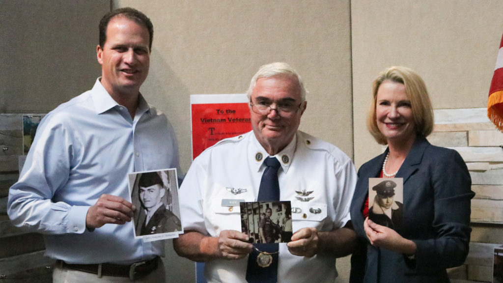 U.S. Congressman August Pfluger and State Senator Dawn Buckingham are pictured with Capt. Paul Wade, who on Oct. 14 received a Purple Heart 52 years after being shot down three times in one day while a member of the 191st Boomerangs. [Photo by Derrick Stuckly]