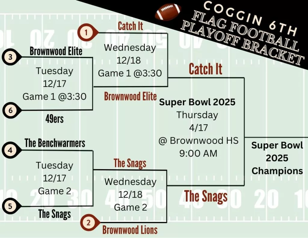 Coggin 6th Grade flag football teams “Catch It” and “The Snags” are scheduled to face off in the 2025 6th Grade Super Bowl event at Brownwood High School on Thursday, April 17, at 9:00 a.m.