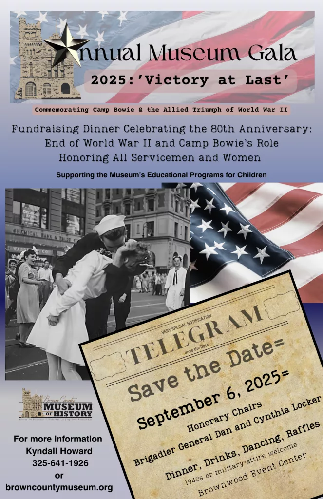 The Brown County Museum of History is thrilled to let our friends know that our second annual fundraising gala, “Victory at Last,” celebrating Camp Bowie and the 80th anniversary of the end of World War II is coming in September.