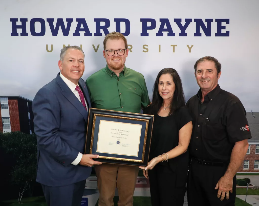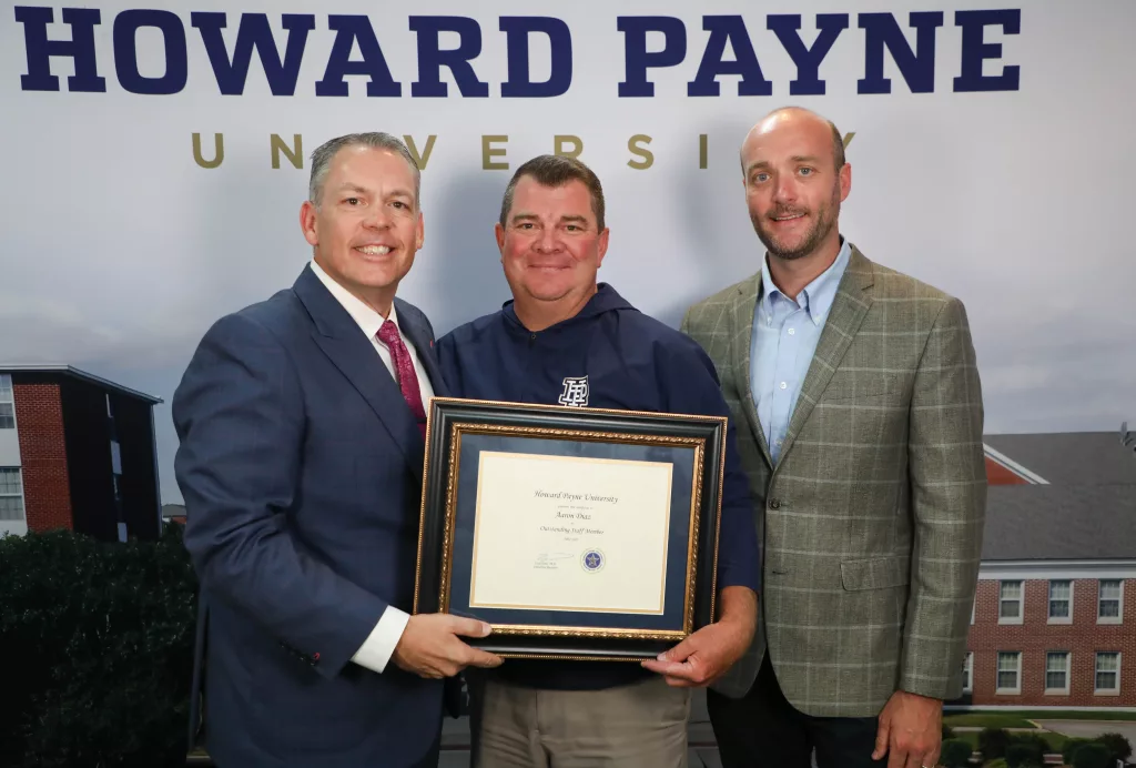 Howard Payne University recently recognized members of faculty and staff at an annual personnel luncheon held on campus. Dr. Chris Rosborough, associate professor of music, director of choral activities and department chair, received the Outstanding Faculty Member Award. Aaron Diaz, grounds supervisor, received the Outstanding Staff Member Award. The outstanding faculty and staff awards are made possible by Underwood’s Cafeteria and Porter/BKCW Insurance Agency, respectively.