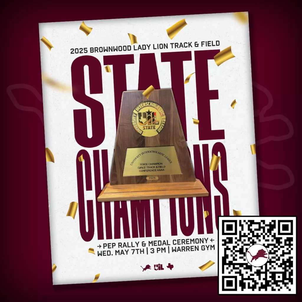 The State Championship Celebration Pep Rally for the Brownwood Lady Lions Track Team will be streamed live on Wednesday, May 7. The event will be held at 3:00 p.m. in Warren Gym on the Brownwood High School campus and will honor the first team state championship for a BHS girls program in school history! Watch live at https://www.brownwoodisd.org/llsc.
