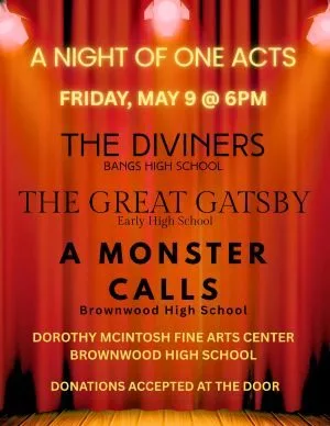 A night of one-act plays will take place at 6 p.m. Friday, May 9 at the Dorothy McIntosh Fine Arts Center at Brownwood High School. Donations will be accepted at the door. Performing will be Bangs High School with The Diviners, Early High School with the Great Gatsby, and Brownwood High School with A Monster Calls.