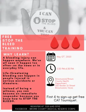 Free ‘Stop The Bleed’ training will take place at 5:30 p.m. Monday. May 12 at the Brownwood/ Brown County Health Department at 305 Booker Street. A bleeding injury can happen anywhere and Life threatening bleeding can happen in people injured in serious accident or disasters. Instead of becoming a witness, you can become an immediate responder by knowing how to stop the bleed. To register, call 325-643-3793.