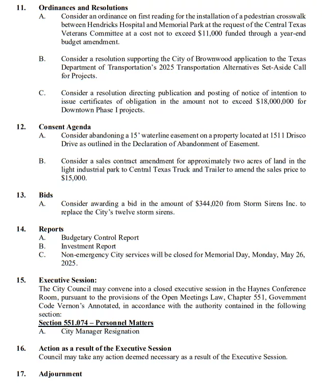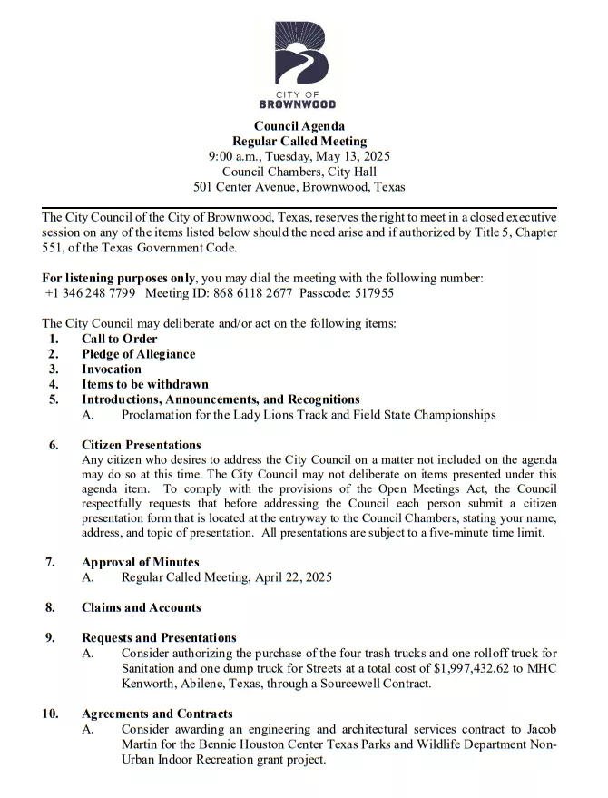 Brownwood City Council to hold May 13 meeting May 9, 2025 at 5:17 pm Updated: May 11th, 2025 at 8:01 am Derrick Stuckly Announcements Local News Tweet Share Reddit +1 Pocket LinkedIn