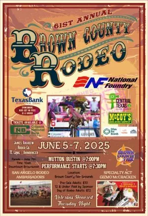 The Brown County Rodeo has been a western tradition here in Brownwood since 1964. Entries are being accepted for the Brown County Rodeo Parade on Saturday morning June 7th at 10 am. You can contact Meredith Locker at 325-642-3819 or check it out on the Brown County Fair Association Facebook for more details and entry forms.