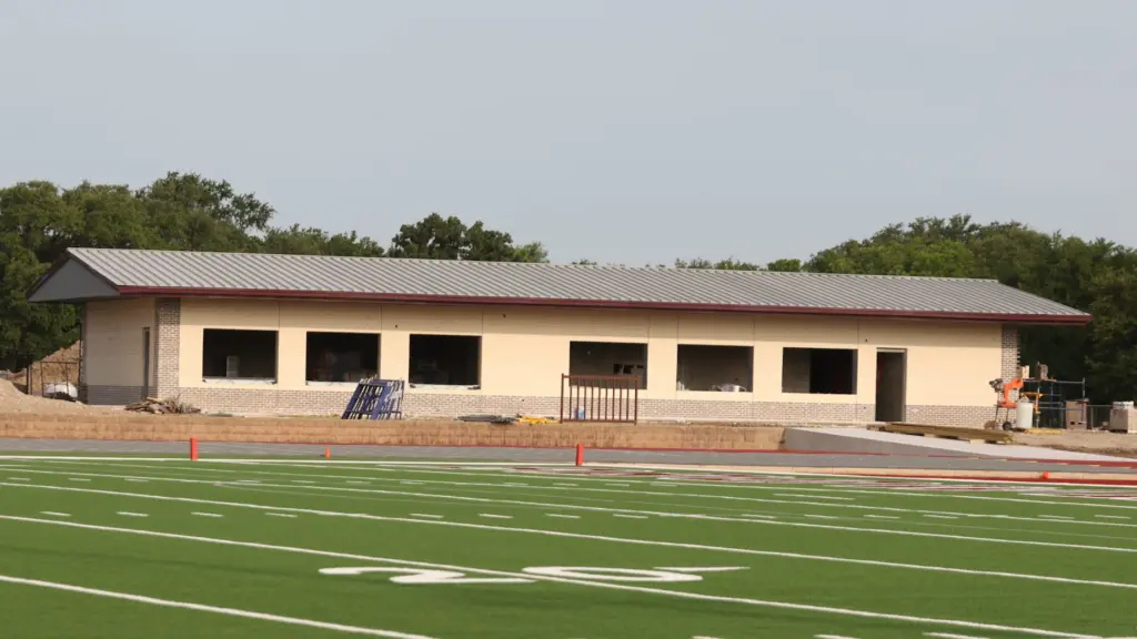 At the north end, construction of the new concession stand and restrooms is nearing completion, and a sidewalk and fencing around the north end zone and track are finished.
