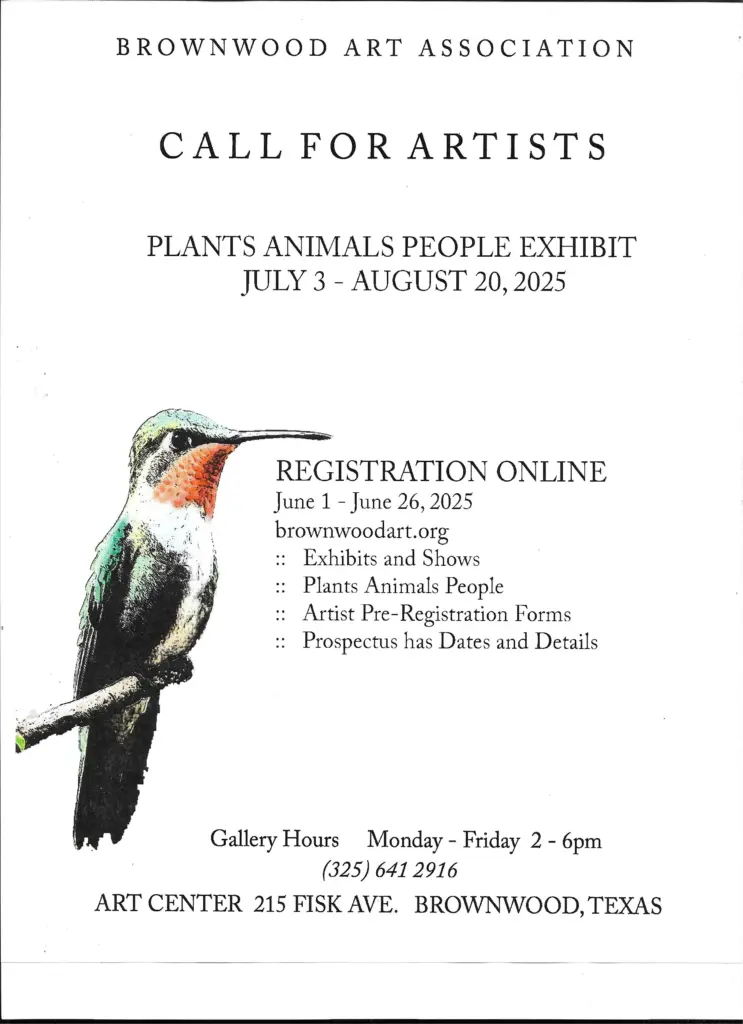 The Brownwood Art Association is inviting artists in all styles and media to share their works in an exhibit celebrating living things: Plants, Animals, People.