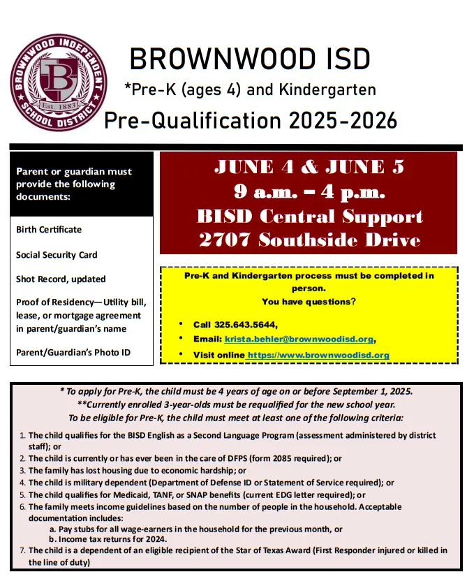 Brownwood ISD Pre-K and Kindergarten Pre-Qualification events for the 2025-26 school year will take place at the Brownwood ISD Central Support Center (2707 Southside Drive) on Wednesday, June 4 and Thursday, June 5 from 9am to 4 pm.