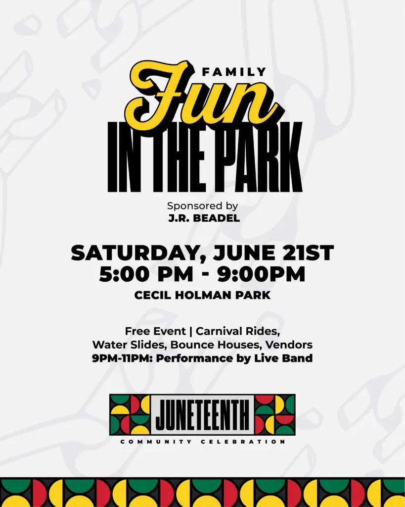 Saturday at 5pm, come out and enjoy the Fun in the Park, located at Cecil Holman Park. Enjoy Free carnival rides, bounce houses, water slides, food/drink vendors, merchant vendors and more. When the sun goes down at 9pm, there will be a free concert in the park.