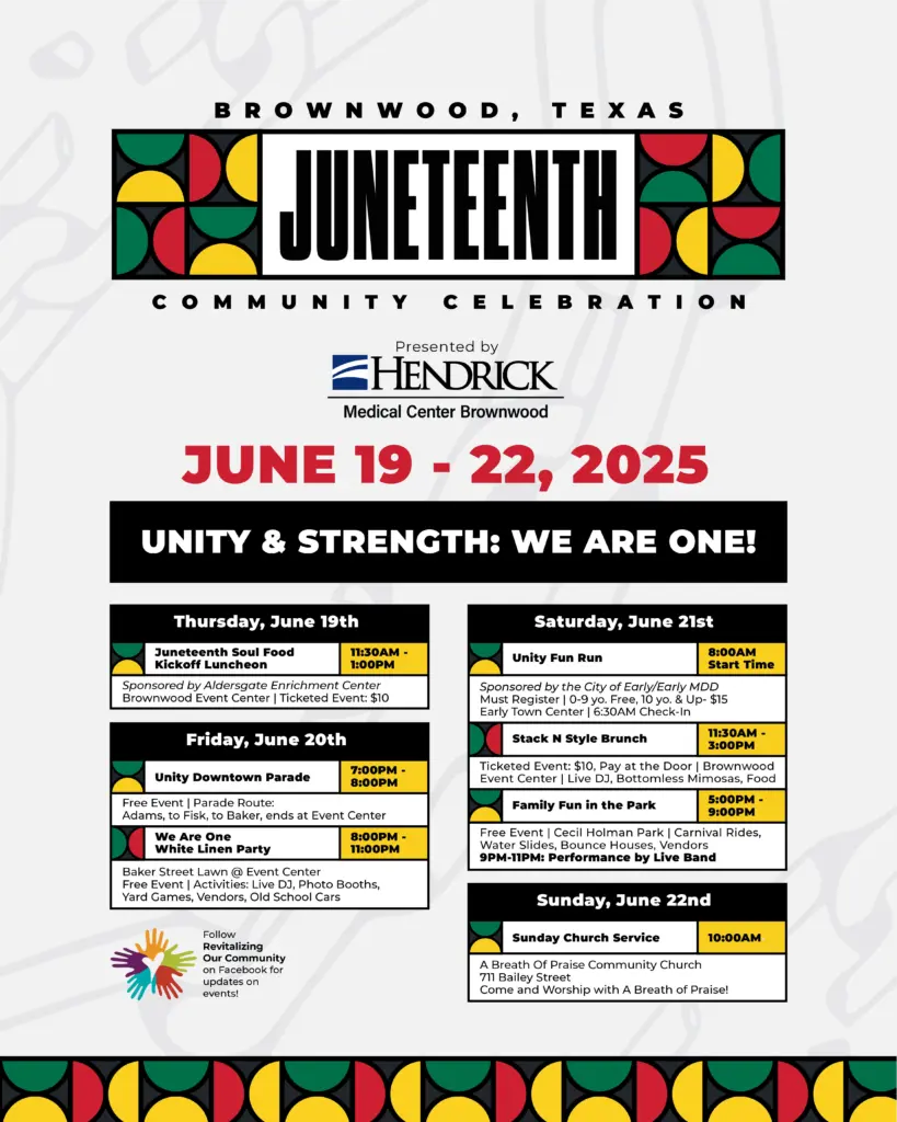 Revitalizing Our Community and the Juneteenth Committee are gearing up for the 2025 Juneteenth Community Celebration sponsored by Hendrick Medical of Brownwood. The celebration is scheduled for June 19th-22nd. Juneteenth is a federal holiday marking the day June 19th 1865, when the union soldiers landed in Galveston Bay, to inform all slaves that President Lincoln had signed the Emancipation Proclamation, ending slavery which freed all slaves.