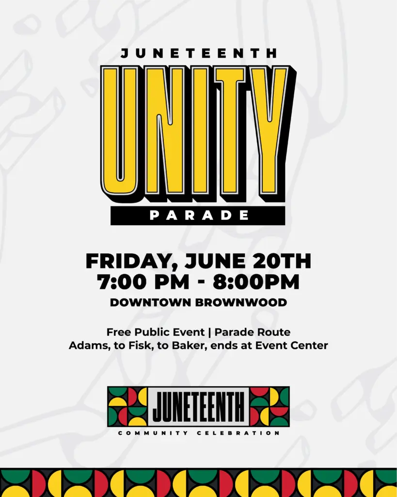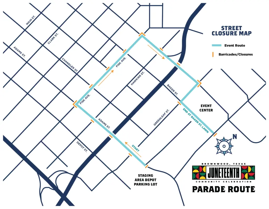 The theme for this year’s celebration is Unity and Strength: We Are One. The celebration kicks off on Thursday June 19th with a Soul Food Luncheon, sponsored by Aldersgate Enrichment Center at the Brownwood Event Center. Ticket for the event are $10; they can be purchased through Venmo @ROCBWD. Friday evening starts with a classic car parade through downtown Brownwood starting at 7pm. The parade route for the Juneteenth Parade is pictured below. Vehicles will stage in the Depot Parking lot. Come out to Adams Street, Turn right on Fisk Ave, travel down to Baker, turn right and end at the Baker Street Lawn. Many of the cars will be parked on Lee Street next to the vendors for the community to get a closer look. Following the parade at the Baker Street Lawn is the White Linen Party sponsored by Waldrop Construction.