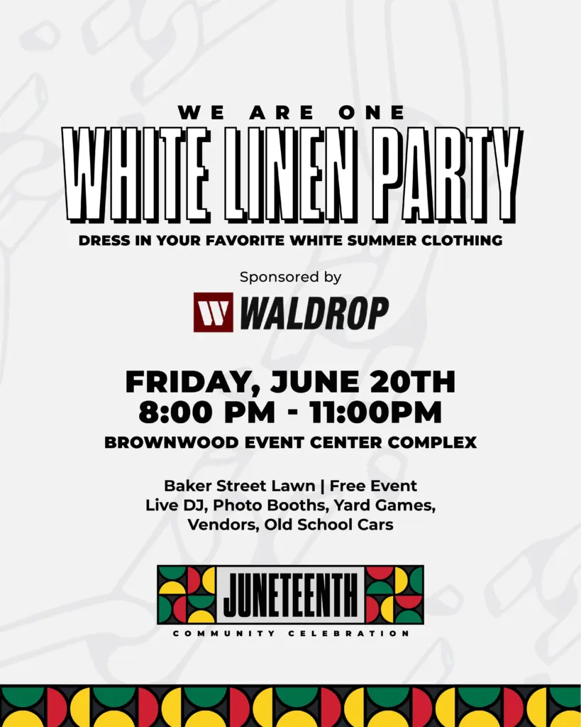 After the parade, the community is invited to continue the celebration at the White Linen Party, sponsored by Waldrop Construction. Everyone is encourage to wear your best white summer outfit, the event will be held on the Baker Street lawn, there will be food and drink vendors, a live DJ, Photo booths and lawn games.