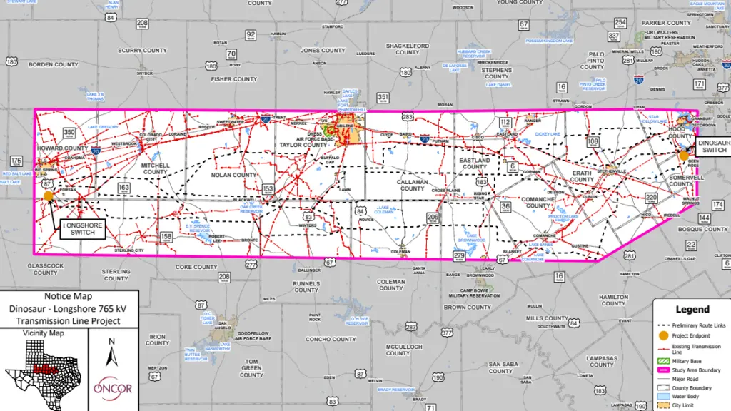 Oncor Electric Delivery Company LLC (Oncor) is proposing to construct a new 765 kilovolt (kV) transmission line from Oncor’s proposed Dinosaur Switch, near Glen Rose to to Oncor’s existing Longshore Switch near Forsan in Howard County. The line is expected to be 235-270 miles depending on which route is used.