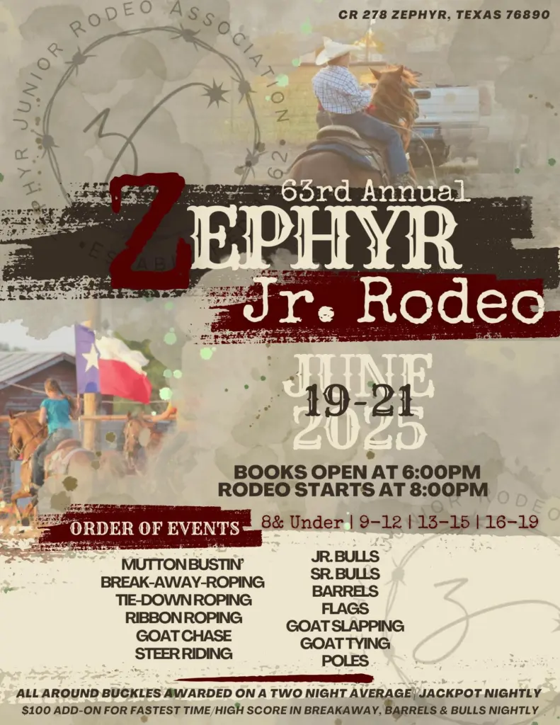 The 63rd Annual Zephyr Junior Rodeo will take place Thursday, June 19 through Saturday, June 21 on County Road 278 in Zephyr.