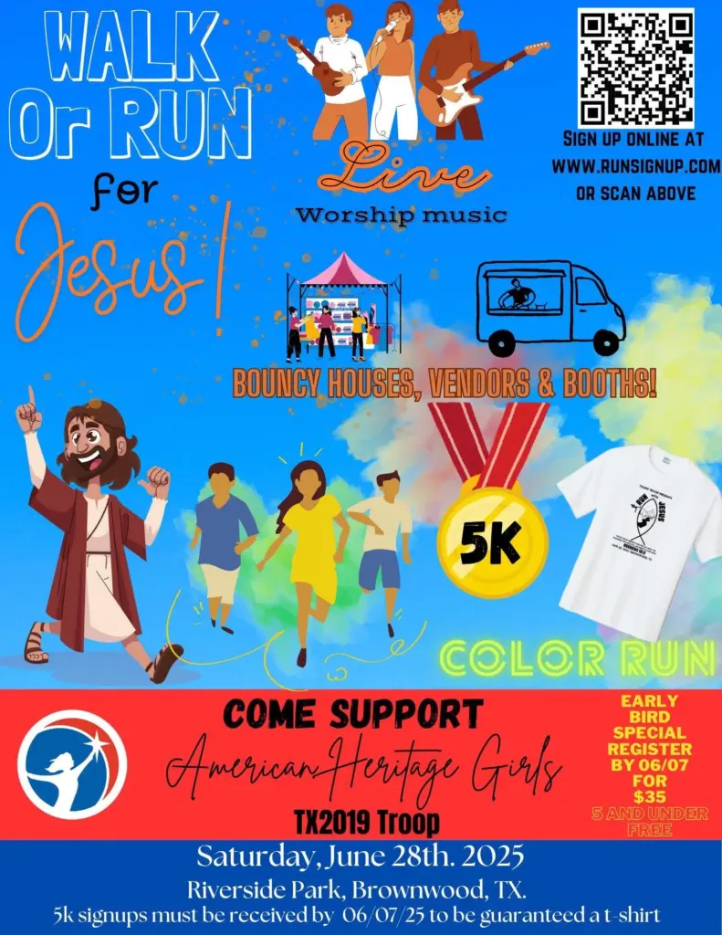 American Heritage Girls-Brownwood is hosting a Run for Jesus 5k! Come support this local nonprofit organization by coming to their fundraiser!