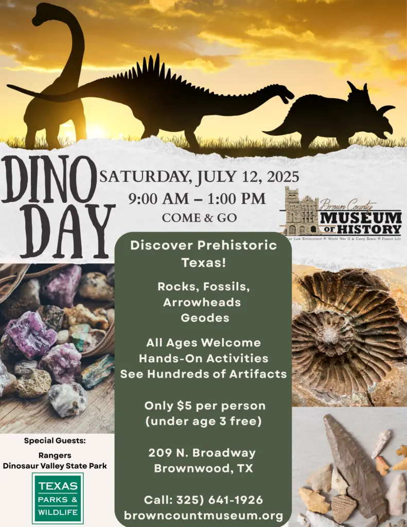 The Brown County Museum of History will open its 5th “Dino Day”, a fun and educational journey into prehistoric Texas. This year includes an expanded exhibit of over 100 rocks, minerals, and gemstones. Visitors of all ages can be hands-on with real fossils, arrowheads, geodes, mammoth bones, and fossilized sea creatures. Rangers from Dinosaur Valley State Park will be on site sharing their knowledge and expertise at a special dig table.
