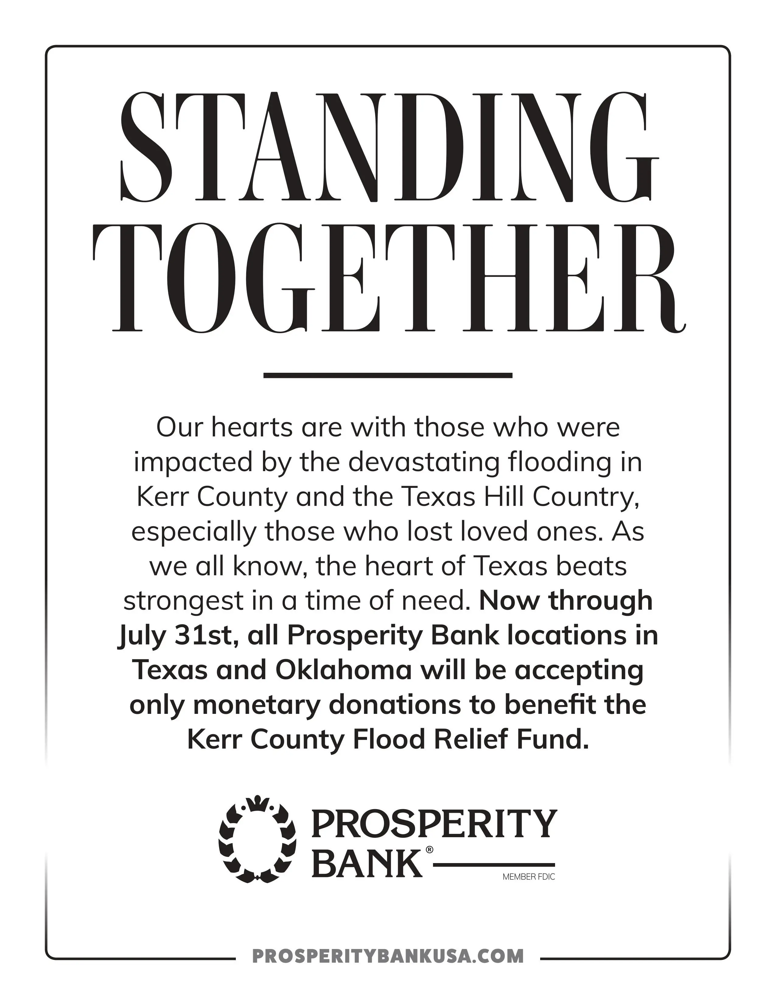 Prosperity Bank locations in Brownwood and Early are now accepting donations benefiting the Kerr County Flood Relief Fund. If citizens would like to donate they may visit the Brownwood Banking Center at 1221 Austin Ave or the Early Banking Center at 305 Early Blvd.