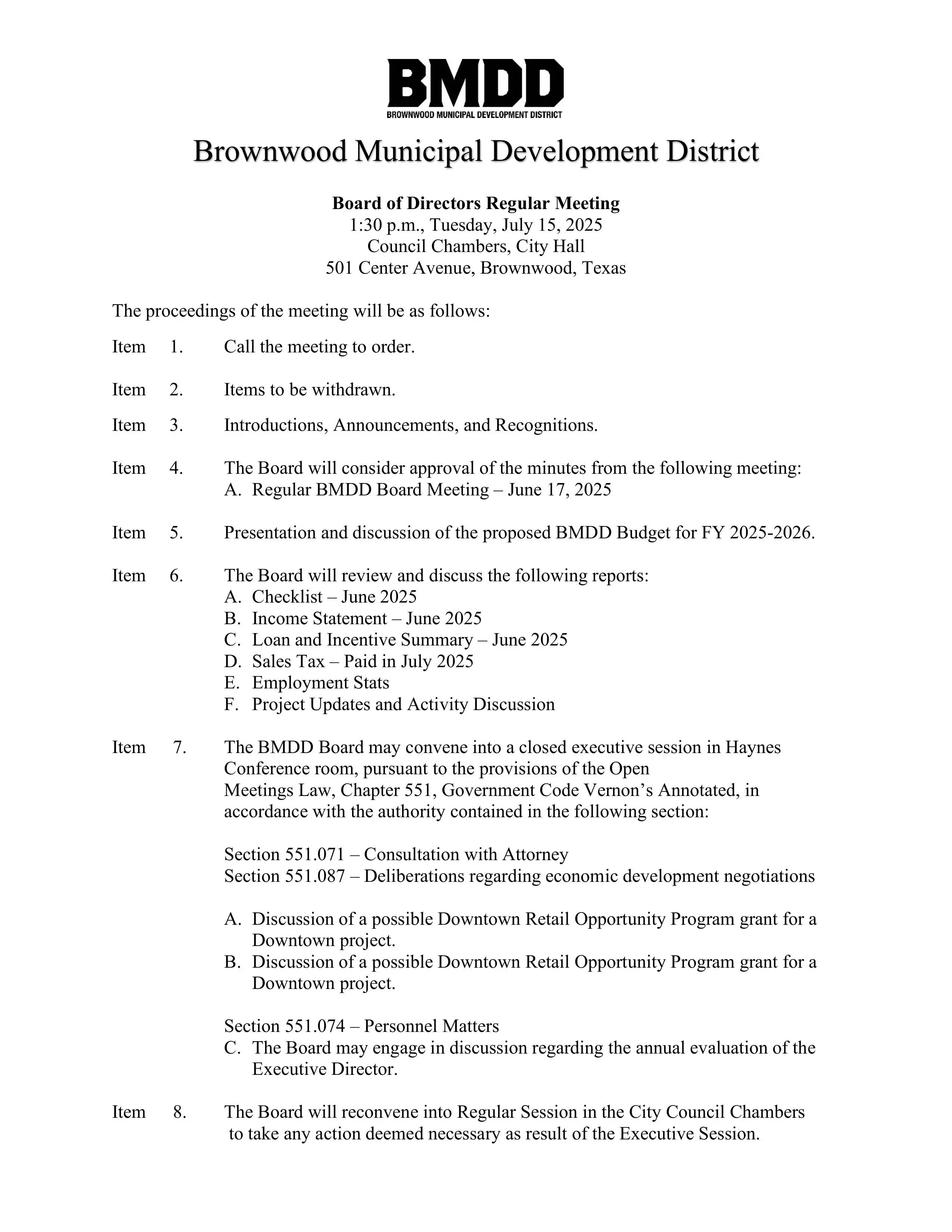 Brownwood Municipal Development District agenda for July 15 meeting July 11, 2025 at 10:39 am kadenbessent Business Local News Tweet Share Reddit +1 Pocket LinkedIn