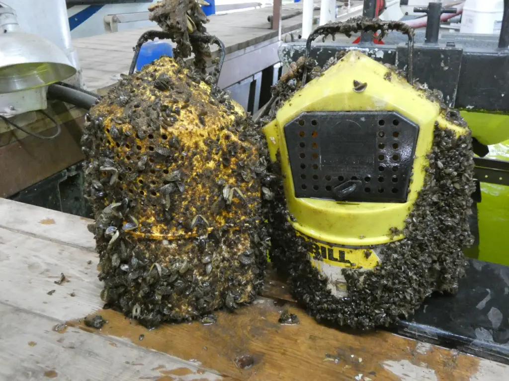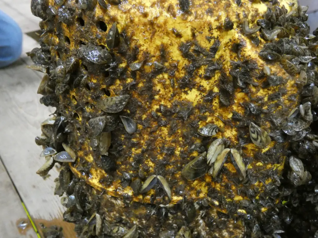 The National Park Service says zebra mussels “are filter-feeders that siphon particles of plankton from the water. They are highly efficient at this, and a large population of mussels can quickly clear the water of almost all floating particles. This change can cause shifts in local food webs, both by robbing food from native species that feed on plankton, and also by increasing water clarity and thus making it easier for visual predators to hunt… Once a population of zebra mussels has become established in a water body, there is very little to be done to remove them.”