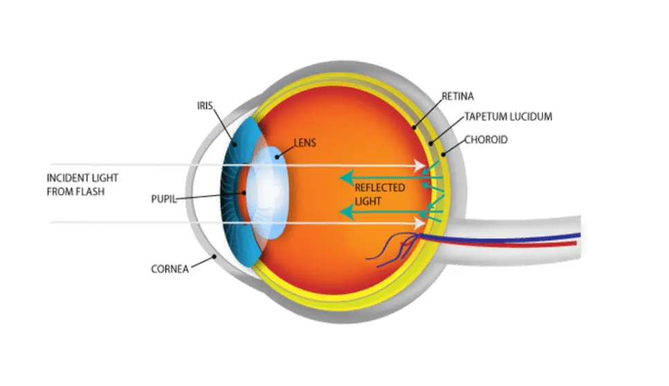 The tapetum lucidum is a reflective layer located behind the retina in the eyes of many nocturnal and crepuscular animals. It acts like a mirror, reflecting light that passes through the retina back into the photoreceptor cells, effectively giving the eye a second chance to absorb light. This enhances night vision and creates the glowing “eye shine” effect when light hits the eyes at night.