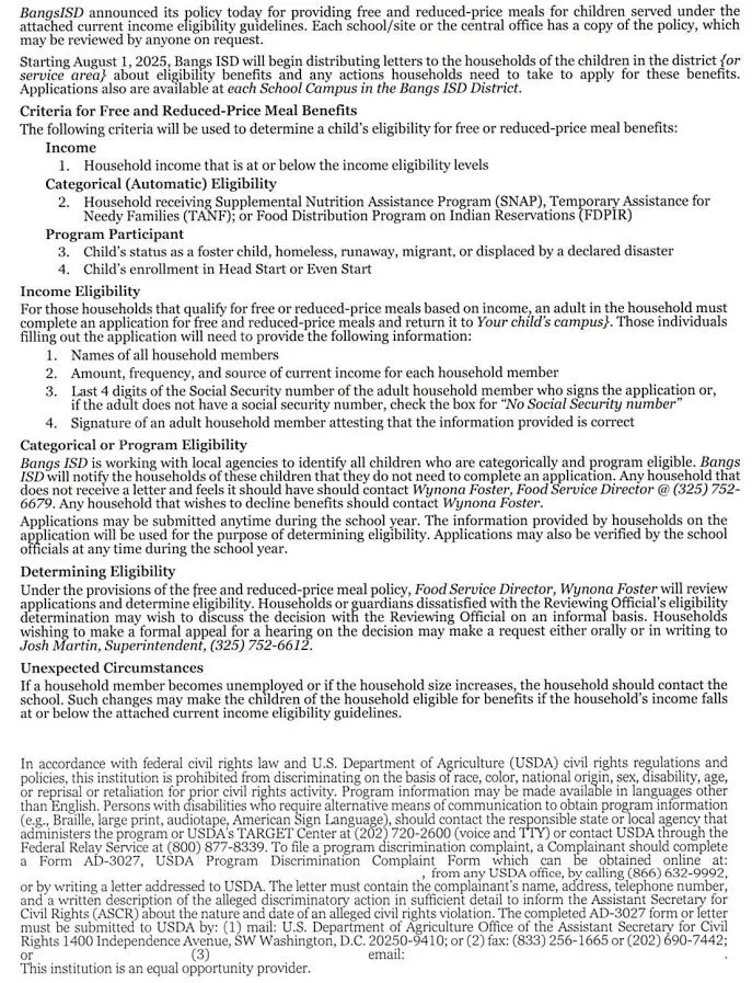 Bangs ISD reveals free and reduced-price meal policy