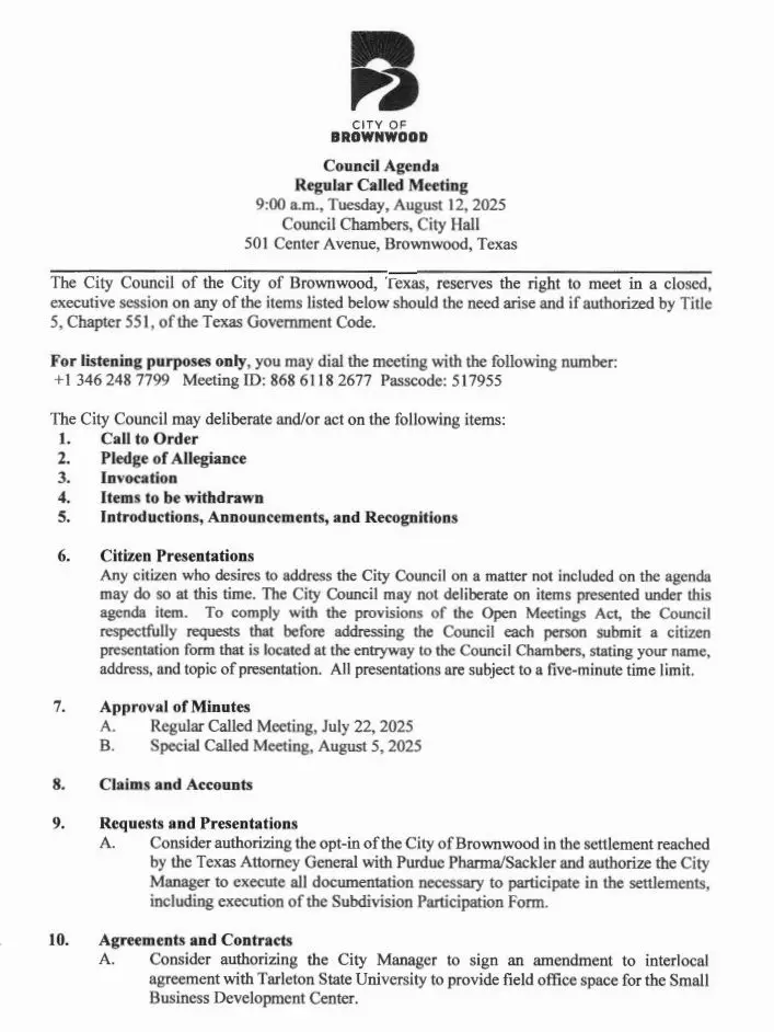 Brownwood City Council to convene Aug. 12 August 6, 2025 at 4:06 pm Updated: August 7th, 2025 at 7:37 am Derrick Stuckly Announcements Local News Tweet Share Reddit +1 Pocket LinkedIn