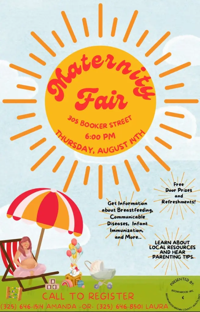 Brownwood WIC and Brownwood/Brown County Health Department would like to invite all expecting parents to the Quarterly Maternity Fair! It will be Thursday, August 14th at the Health Department Building located at 305 Booker St. We will have community partners presenting information about childbirth, infant care, immunizations and breastfeeding, as well as snacks, give aways and door prizes! Please call Brownwood WIC to register at 325-646-1514.