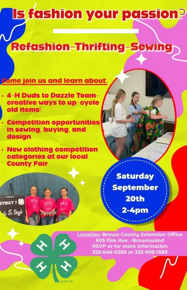 Join us on August 24th from 4-6pm at the Extension Office for our first practice of the year! If you have any questions, please contact Sherri Land at 325-642-5604.