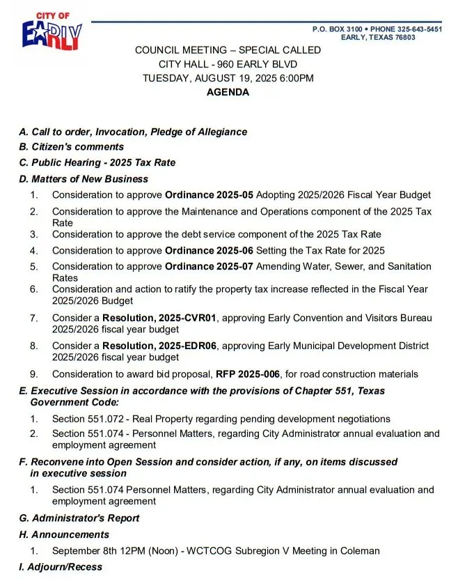 Special called meeting of Early City Council Aug. 19 August 15, 2025 at 8:02 am Updated: August 16th, 2025 at 10:20 am Derrick Stuckly Announcements Local News Tweet Share Reddit +1 Pocket LinkedIn