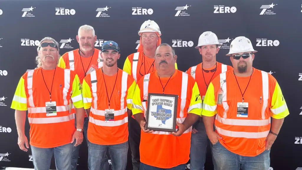 The Texas Department of Transportation’s Brownwood District team earned top honors at the inaugural TxDOT Equipment Operator Roadeo, held Thursday, August 14, at the South Tarrant County Area Office in Fort Worth. The district earned the Team Championship Award for achieving the highest overall team score among 25 competing districts and TxDOT’s Fleet Operations Division.