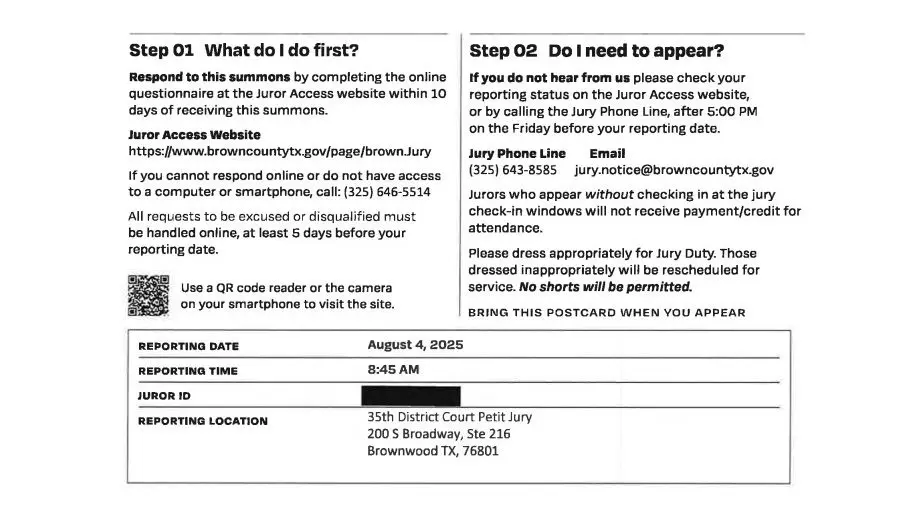 The official jury summons will be sent by mail as a postcard. The postcard will provide guidance regarding responding to the summons, when and where to appear, and will feature a QR code that links to the juror online response system which is available 24/7. Jurors will be able to complete the questionnaire, claim an exemption, notify the court of disqualification, and request deferrals. Access to the juror online response system will continue after registration to check on the status of jury service. Once registered by filling out the juror questionnaire, potential jurors will receive emails and text message reminders of service date and time and alerts if jury has been cancelled.