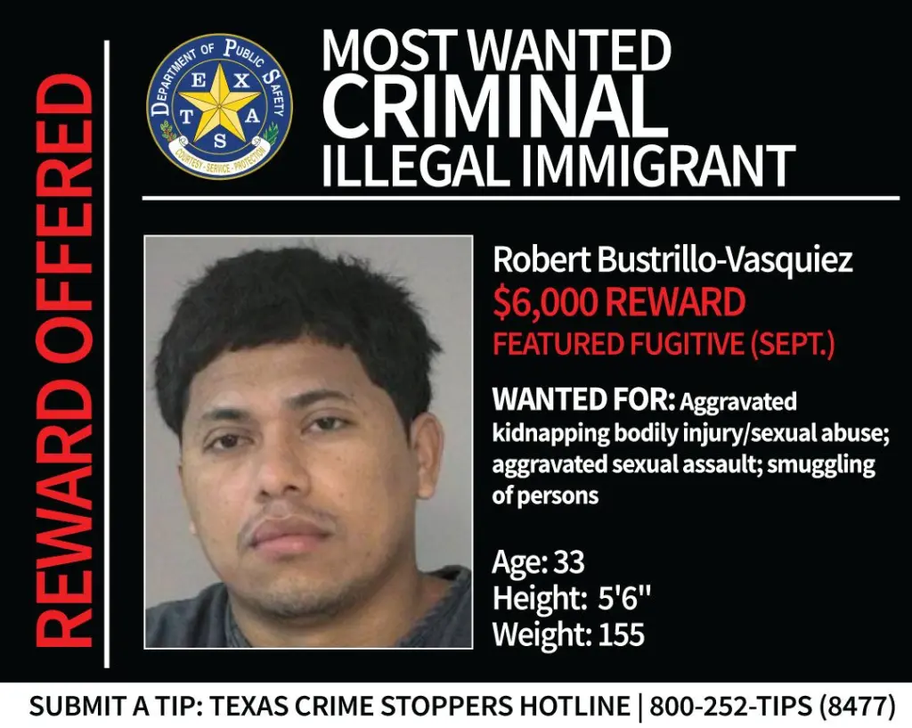 AUSTIN – Texas 10 Most Wanted Criminal Illegal Immigrant Robert Bustrillo-Vasquiez — a violent felon with multiple deportations — is this month’s Featured Fugitive. The reward for information leading to his arrest is increased to $6,000 during September if the tip is received this month.