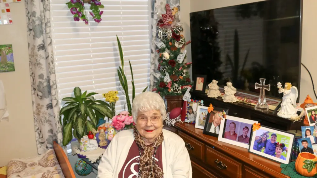 Betty Cooper, 94, is pictured in front of her Brownwood Lions Christmas tree in her room at Oak Ridge Manor