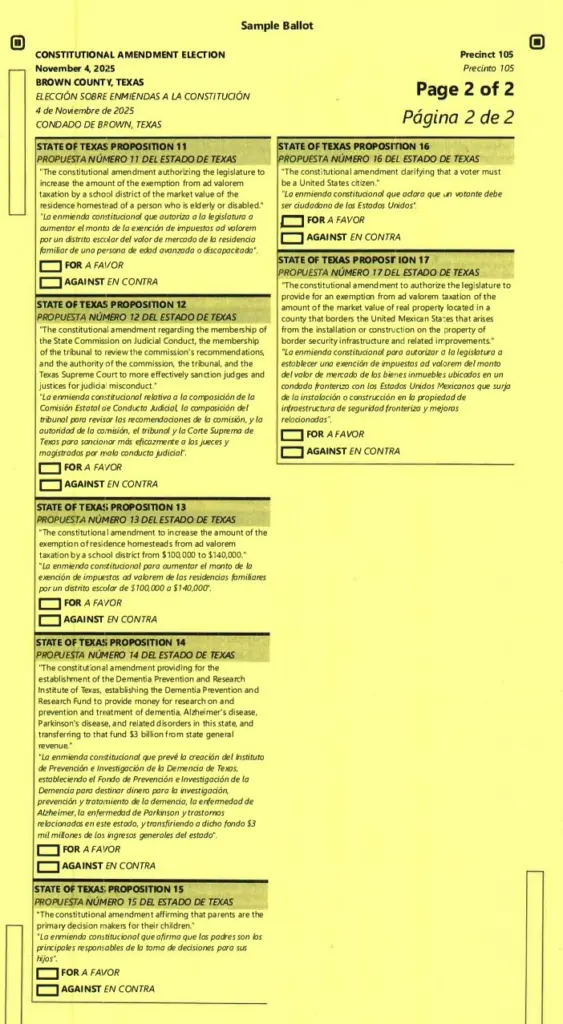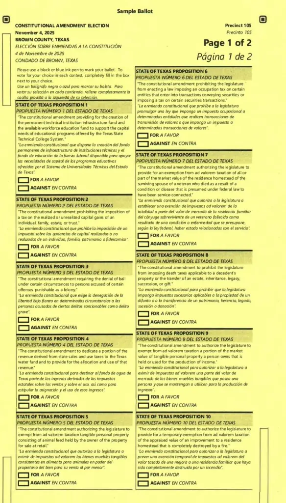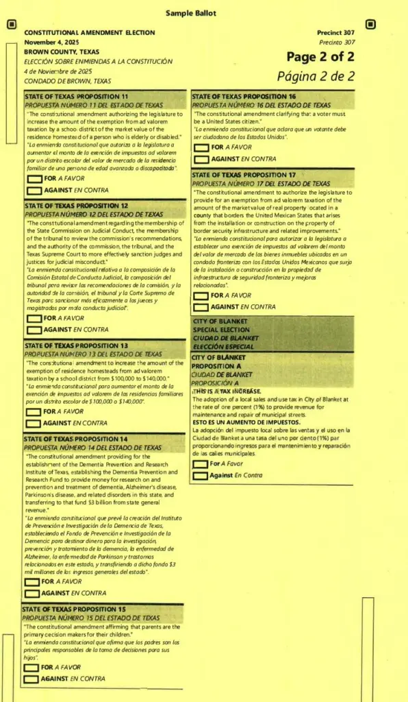 This November 4th, 2025, Election will have the 17 constitutional Amendments on the Ballot as well as an election for the City of Blanket and the Brookesmith Special Utility Board of Directors. Donald Krause, Roger Sikes, James Towery and Jimmy Doud are running for three open positions on the Brookesmith SUD board, while Blanket will vote on a 1 percent local sales and use tax increase to provide revenue for the City to be used for maintenance and repair of municipal streets. Below are polling locations, as well as sample ballots:
