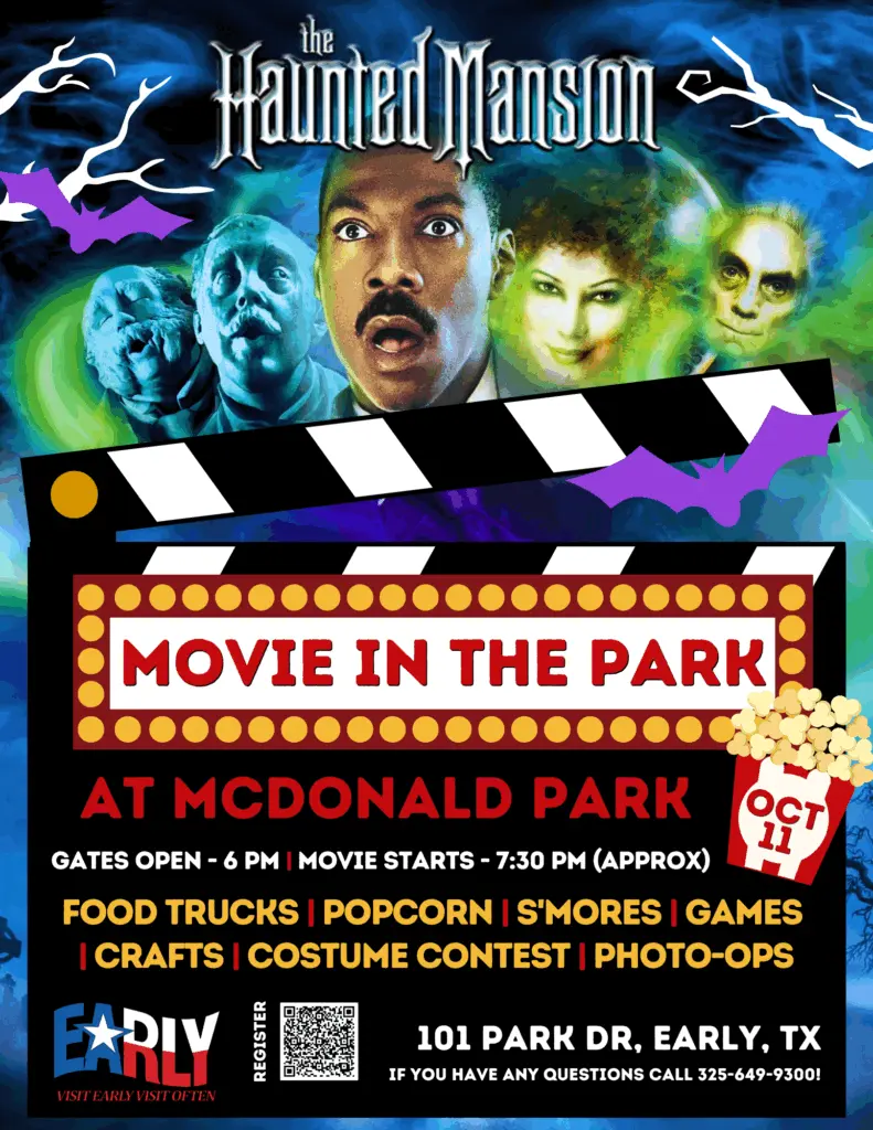 The Early Visitors & Events Center is thrilled to invite you to our annual Movie in the Park event on Saturday, October 11, at McDonald Park, 101 Park Drive, Early, TX. The fun begins at 6:00 PM with an exciting lineup of games, crafts, and activities for all ages! Enjoy complimentary popcorn, s’mores, and drinks, along with mechanical bull riding, photo ops, bubble blast inflatables, and a variety of food trucks on-site for dinner options.