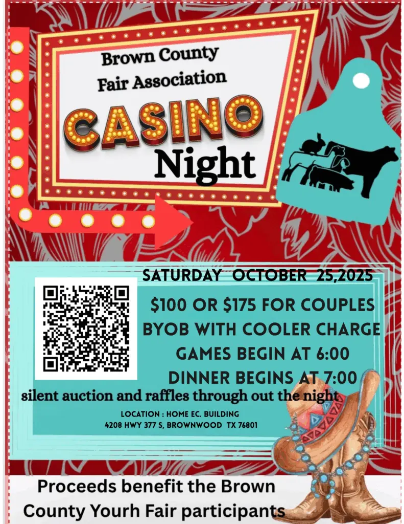 The Brown County Fair Association will hold a Casino Night fundraiser at the Brown County Fairgrounds Home Ec Building the evening of Saturday, Oct. 25.