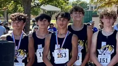 Competing for the Tigers were Alex Valdes (8th, 18:36.8), Leo Valdes (10th, 19:07.6), Wyatt Meadow (16th, 19:29.1), Karter Keel (42nd, 21:06.8), and Kade Russell (128th, 28:04.4).