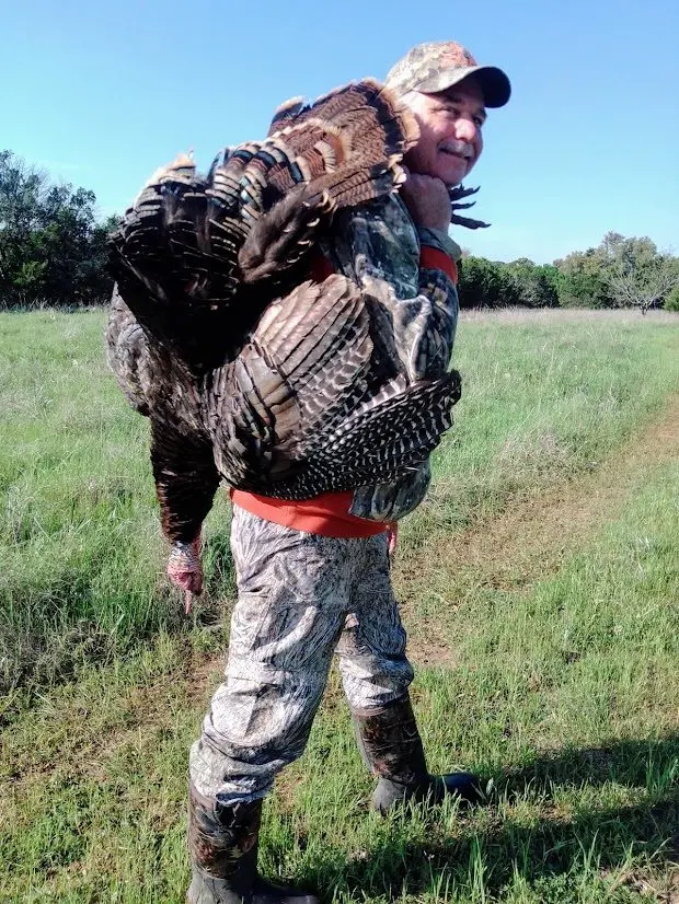 The trick when hunting a flock of turkey at such close range is getting the bow drawn. With their Xray vision, turkey are quick to pick up on the slightest movement. I usually draw my bow low in the blind as soon as I see the birds approaching and move it up to shooting position and wait until they settle down feeding. Thank goodness for the eighty percent let off of today’s modern compound bows. At full draw I’m only pulling about 13 pounds and this is doable for even an old man (me) for the minute or two it takes for the birds to get into shooting position.