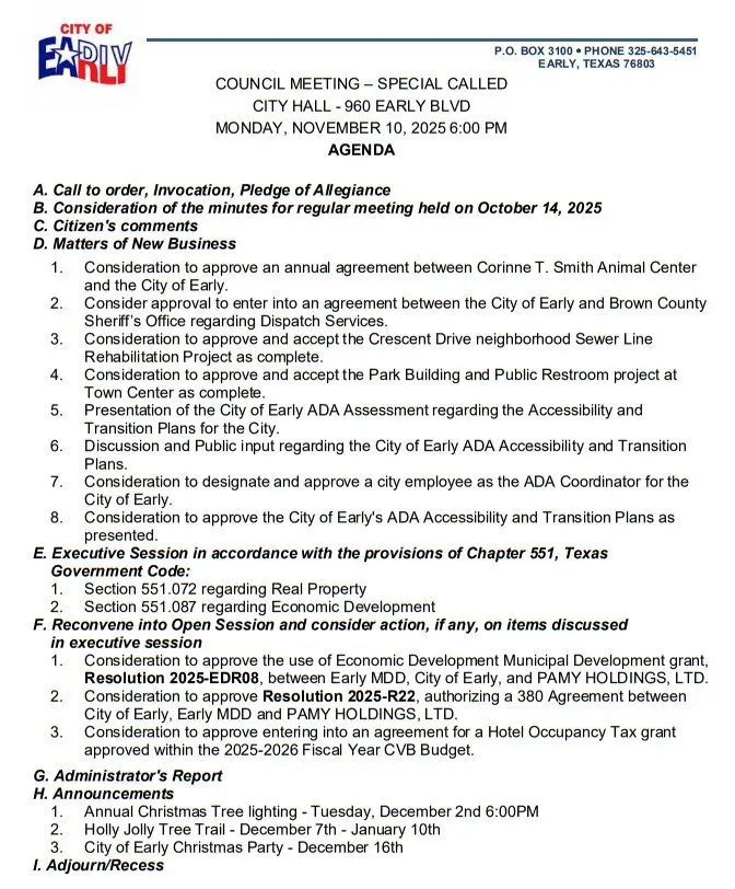 Early City Council to hold Monday, Nov. 10 meeting November 4, 2025 at 6:35 pm Updated: November 5th, 2025 at 5:49 am Derrick Stuckly Announcements Local News Tweet Share Reddit +1 Pocket LinkedIn