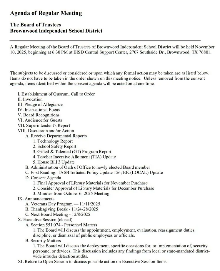 BISD Board of Trustees meeting Nov. 10 November 6, 2025 at 11:12 am Updated: November 7th, 2025 at 6:58 am Derrick Stuckly Announcements Local News Tweet Share Reddit +1 Pocket LinkedIn