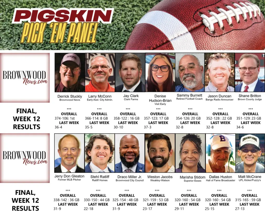 Listed are the final results from Year 1 as BrownwoodNews.com presented its inaugural Pigskin Pick ‘Em Panel – 14 Brown County residents each week giving their best guesses at 40 high school, college and pro football games: