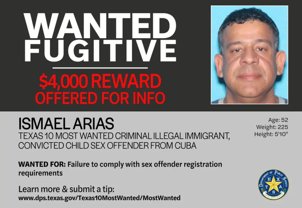 AUSTIN – Texas 10 Most Wanted Criminal Illegal Immigrant Ismael Arias – a convicted child sex offender from Cuba – is this month’s Featured Fugitive. The reward for information leading to his arrest is increased to $4,000 during November if the tip is received this month.