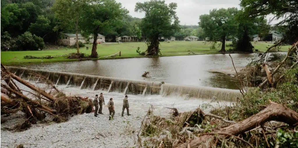 Texas Game Wardens around Mystic Camp in Hunt on July 5, 2025 after the devastating flood. {Photo by Brenda Bazán for The Texas Tribune}