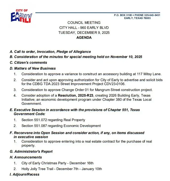 Early City Council meeting scheduled for Dec. 9 December 3, 2025 at 4:18 pm Updated: December 5th, 2025 at 6:23 am Derrick Stuckly Announcements Early, Texas News Local News Tweet Share Reddit +1 Pocket LinkedIn