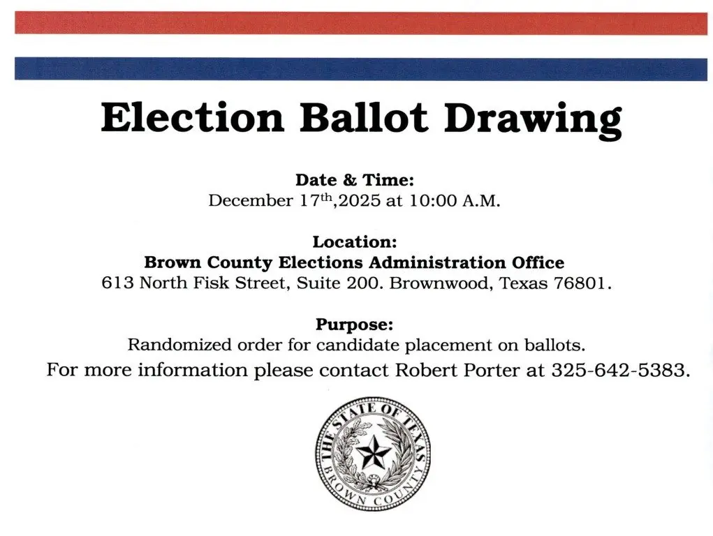 There will be a drawing at 10 a.m. Wednesday, Dec. 17 at the Brown County Elections Office to determine placing on the ballot.