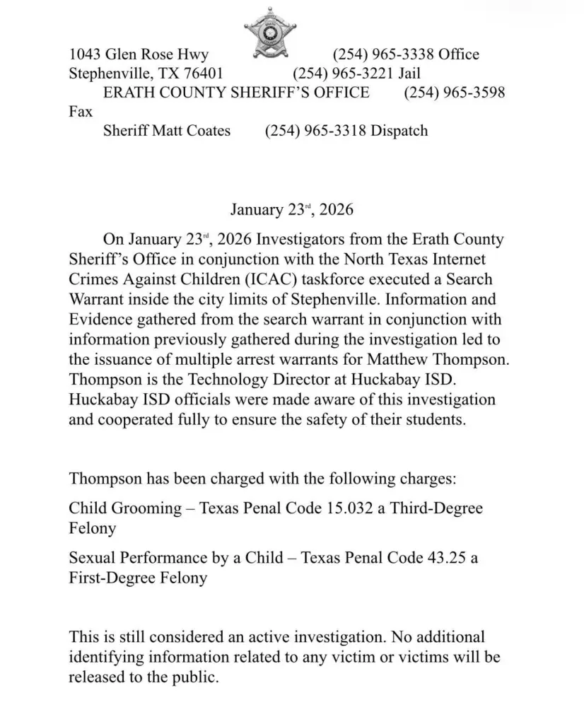 Huckabay ISD employee arrested on charges of child grooming, sexual performance by a child